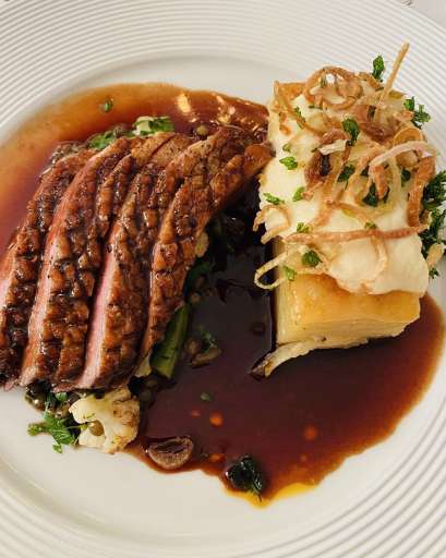 Vitpeppar & timjanstekt kalvytterfilé Selleripuré & säsongens primörer, Charlottenlökssky med citron & timjan Potatisterinne med parmesan 335:- ~ Helstekt oxfilé serverad med ört & ramslökssmör, bakad sparris, kvisttomat & mustig rödvinsås samt potatisterrine med Västerbottenost 345:- ~ Rosmarinstekt svensk lammrostbiff med lavendelsky, Potatisterrinne med getost, grönsaksragu med tomat & vitlökskräm 320:- ~ Svensk dovhjortsadel med kryddig pumpacreme, bakade rotsaker ,vinbärssky samt kroppkaka med svamp & rökt sidfläsk 345:- ~ Örtfärserad fransk majskycklingrullad, grön sparris rostad kycklingsky med soltorkad tomat & basilika ostflammad potatisbakelse 295:- ~ Stekt ankbröst med körsbärssky, timjansglacerade gulbetor & bönor, tryffelpotatispuré 310:- ~ Sirdalsöring med säsongens primörer, rökt forellrom, vitvinssmörsås med gräslök Mandelpotatiskaka med dill 325:- ~ Dill & fänkålsbakad gösfilé med grön sparris, sockerbönor & kryddig hummersås 325:- ~ Belugalinser med rostad vitlök & örter Potatis & blomkålscreme Rostad blomkål & svamp, citronglacerad spetskål rödvinssky 295:-